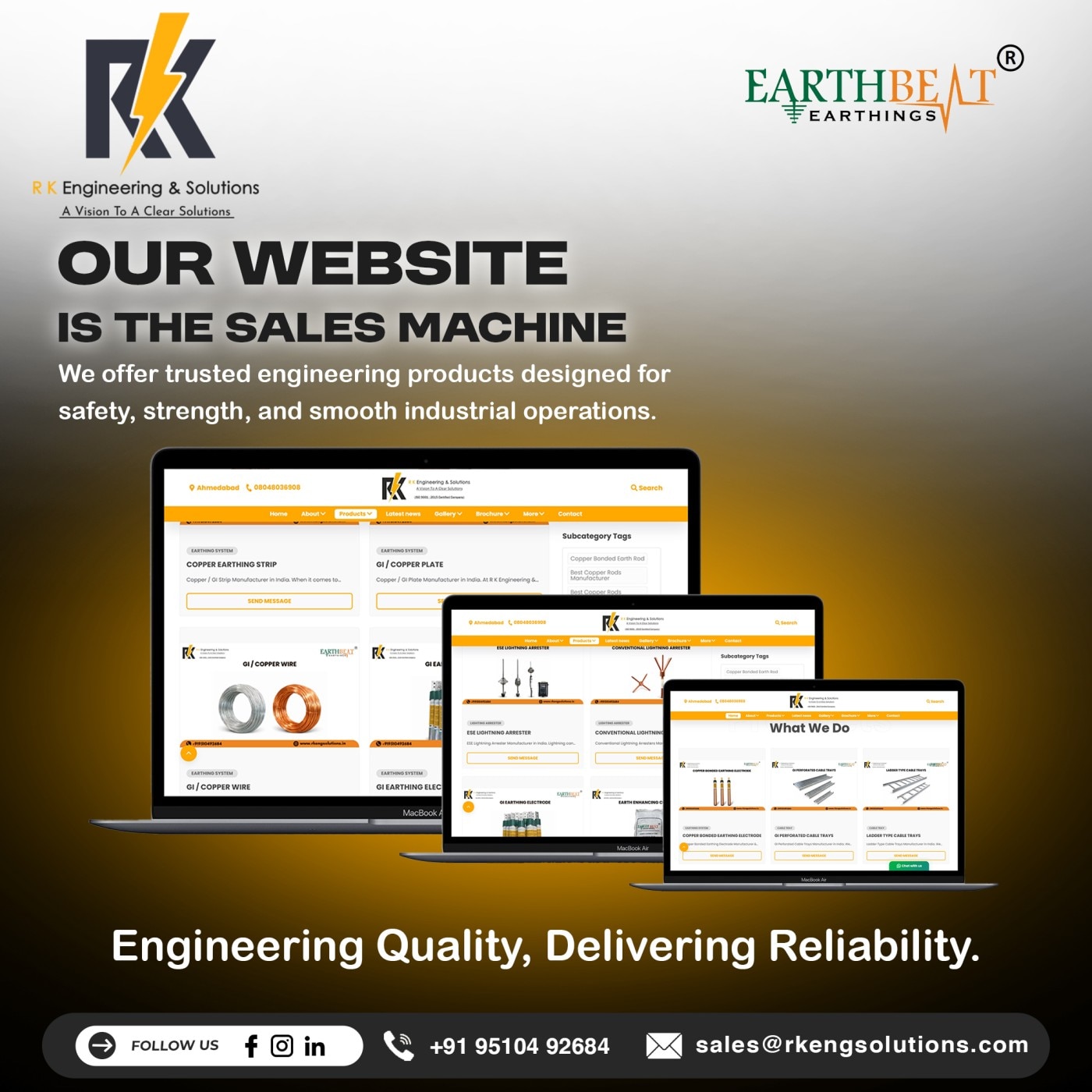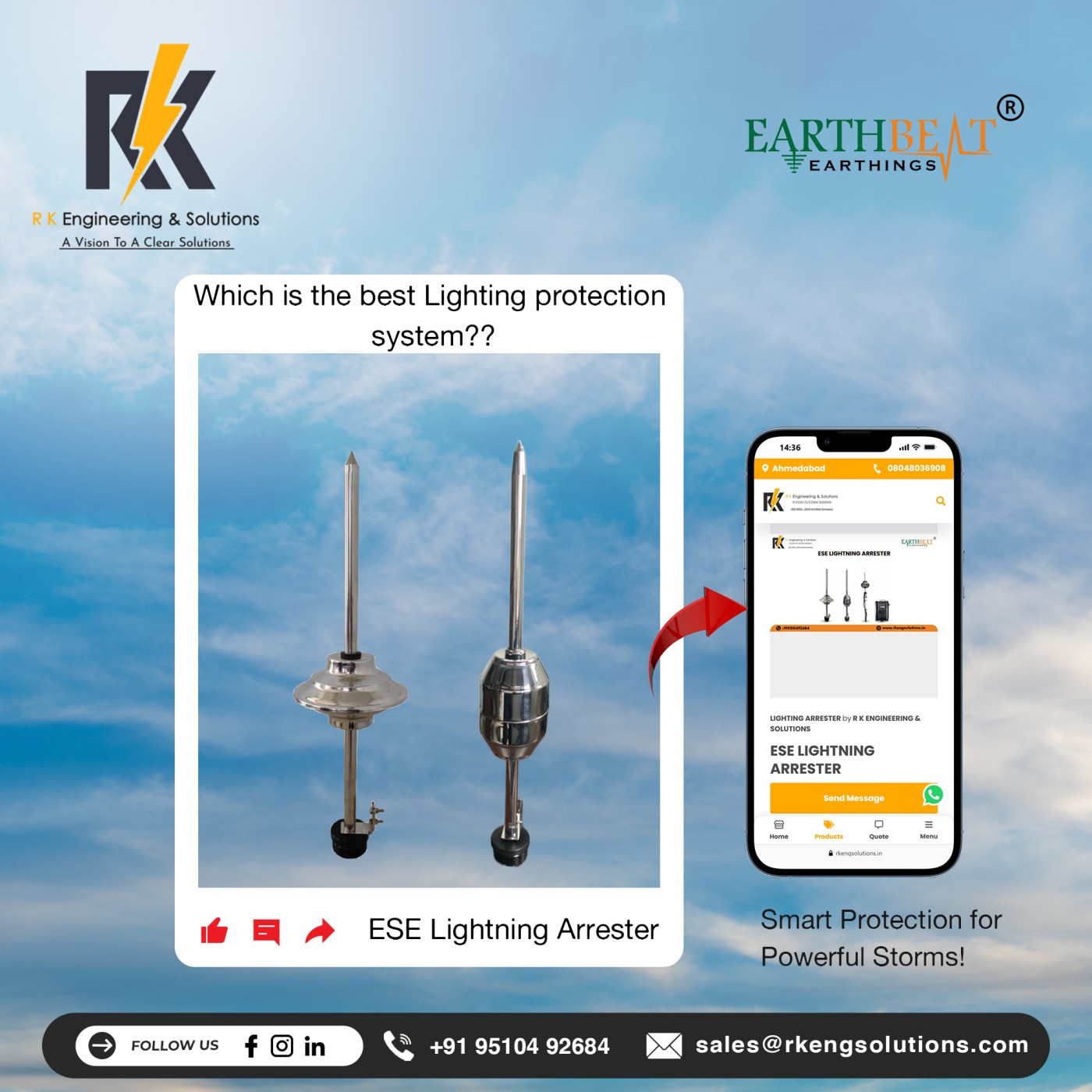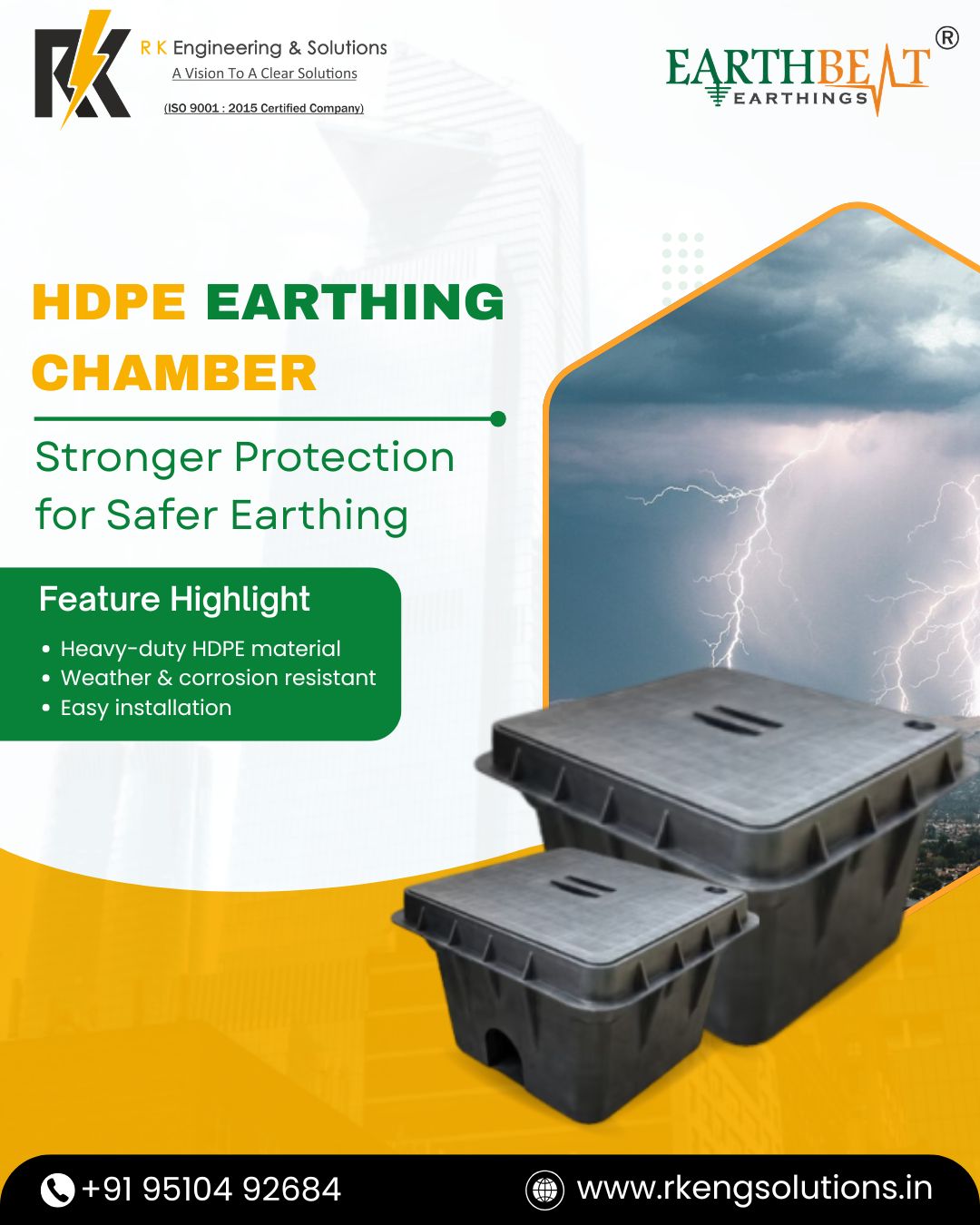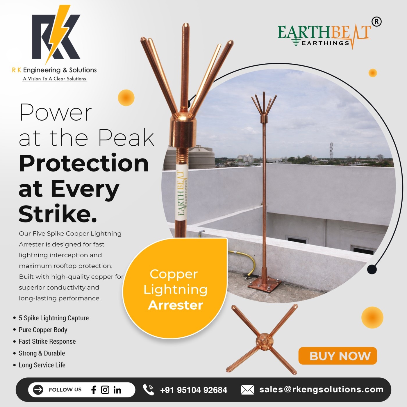 Copper Bonded Earthing Electrode Manufacturer & Supplier in India R K Engineering & Solutions is a trusted and leading Copper Bonded Earthing Electrode manufacturer in India, delivering high-performance and long-life earthing solutions for industrial, commercial, and residential applications. Our premium brand EARTHBEAT – Copper Bonded Earthing Electrodes is engineered to provide maximum protection against electrical shocks, surges, and lightning strikes, ensuring complete electrical safety. With a corrosion-resistant copper bonding layer and 99.9% pure copper, our electrodes are designed to offer unmatched durability, even in harsh soil conditions. Why Choose EARTHBEAT Copper Bonded Earthing Electrodes? Our electrodes are manufactured using advanced copper bonding technology, making them highly resistant to corrosion, electrolytic action, cracks, and splits. Whether the soil is dry, wet, or chemically reactive, EARTHBEAT electrodes maintain superior conductivity and long-term reliability. We also provide complete technical support, installation guidance, and customized sizing options, ensuring that every project receives the right solution. Key Features CPRI Tested for performance, safety, and reliability Continuous Electroplating Process ensures uniform copper bonding Customizable Options available as per client requirements Long-Term Stability with consistent resistance values throughout product life Quick & Easy Installation reducing both installation area and time Benefits Up to 250 Micron Copper Bonded Layer on high-strength steel Extended Life Span significantly longer than traditional GI electrodes High Conductivity & Tensile Strength (average 80,000 psi) Cost-Effective compared to solid copper rods while delivering similar performance Excellent Durability with straightness tolerance of .010’’ per linear foot Highly Reliable for Long-Span Earthing Systems Why R K Engineering & Solutions? We use only the highest-grade raw materials and precision manufacturing techniques to ensure the highest product quality. As leaders in the earthing industry, our focus remains on safety, durability, innovation, and customer satisfaction. For long-lasting and reliable earthing protection, choose EARTHBEAT Copper Bonded Earthing Electrodes from R K Engineering & Solutions. 📞 Contact us today for product details, pricing, or technical consultation.