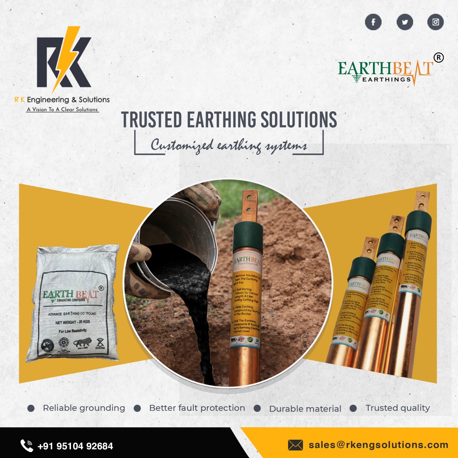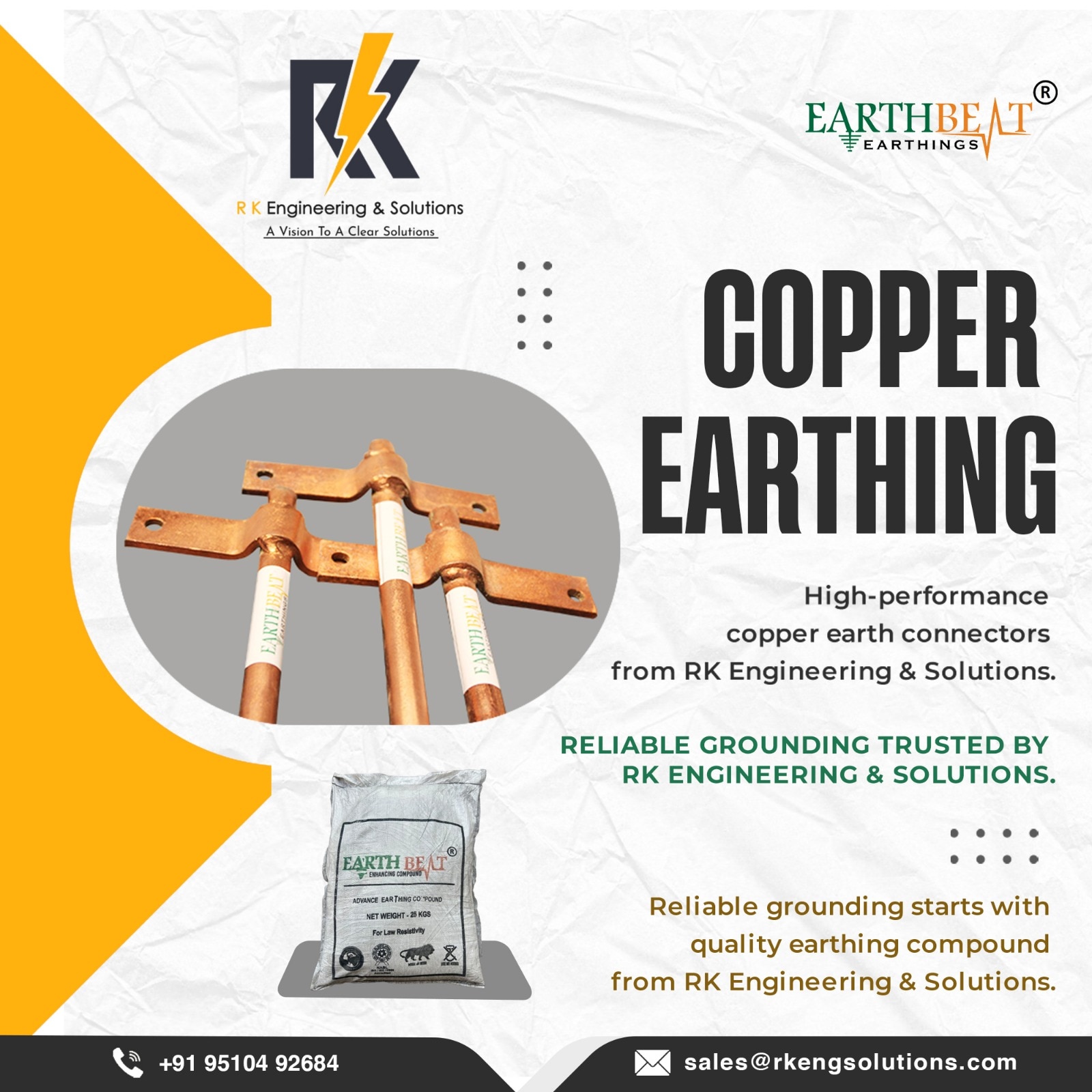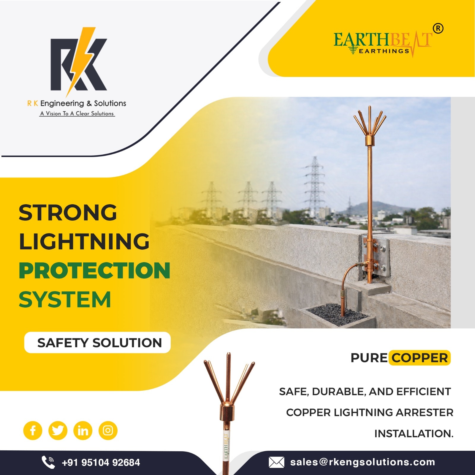 Copper Bonded Earthing Electrode Manufacturer & Supplier in India R K Engineering & Solutions is a trusted and leading Copper Bonded Earthing Electrode manufacturer in India, delivering high-performance and long-life earthing solutions for industrial, commercial, and residential applications. Our premium brand EARTHBEAT – Copper Bonded Earthing Electrodes is engineered to provide maximum protection against electrical shocks, surges, and lightning strikes, ensuring complete electrical safety. With a corrosion-resistant copper bonding layer and 99.9% pure copper, our electrodes are designed to offer unmatched durability, even in harsh soil conditions. Why Choose EARTHBEAT Copper Bonded Earthing Electrodes? Our electrodes are manufactured using advanced copper bonding technology, making them highly resistant to corrosion, electrolytic action, cracks, and splits. Whether the soil is dry, wet, or chemically reactive, EARTHBEAT electrodes maintain superior conductivity and long-term reliability. We also provide complete technical support, installation guidance, and customized sizing options, ensuring that every project receives the right solution. Key Features CPRI Tested for performance, safety, and reliability Continuous Electroplating Process ensures uniform copper bonding Customizable Options available as per client requirements Long-Term Stability with consistent resistance values throughout product life Quick & Easy Installation reducing both installation area and time Benefits Up to 250 Micron Copper Bonded Layer on high-strength steel Extended Life Span significantly longer than traditional GI electrodes High Conductivity & Tensile Strength (average 80,000 psi) Cost-Effective compared to solid copper rods while delivering similar performance Excellent Durability with straightness tolerance of .010’’ per linear foot Highly Reliable for Long-Span Earthing Systems Why R K Engineering & Solutions? We use only the highest-grade raw materials and precision manufacturing techniques to ensure the highest product quality. As leaders in the earthing industry, our focus remains on safety, durability, innovation, and customer satisfaction. For long-lasting and reliable earthing protection, choose EARTHBEAT Copper Bonded Earthing Electrodes from R K Engineering & Solutions. 📞 Contact us today for product details, pricing, or technical consultation.