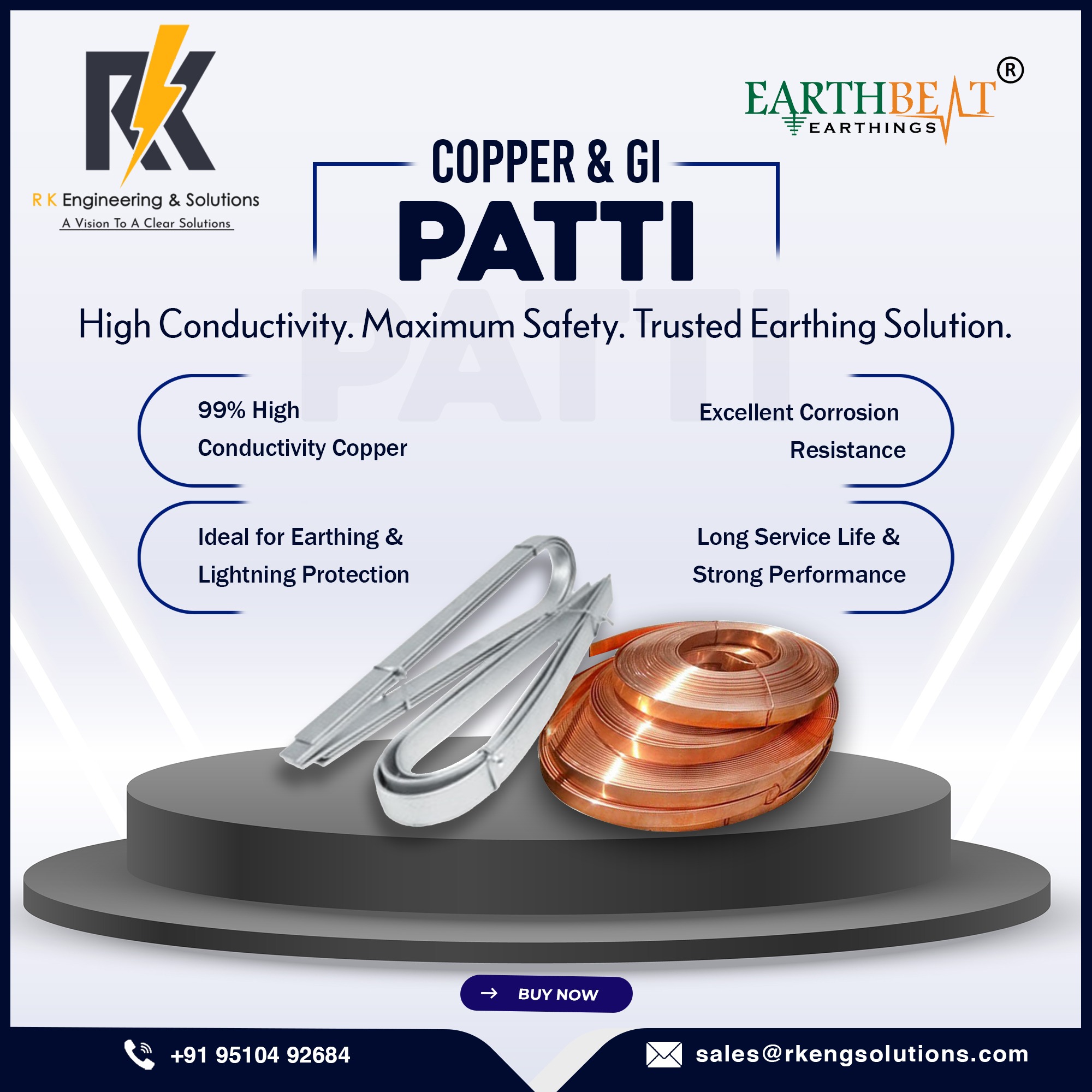 When it comes to reliable earthing solutions, R K Engineering & Solutions stands out as a trusted Copper and GI Patti Manufacturer in Ahmedabad. Our Copper and GI Patti (strips/flats) are crucial components in electrical systems, providing a low-resistance path for safely dissipating fault currents into the ground. This not only safeguards people from electrical shocks but also protects equipment from potential damage.
