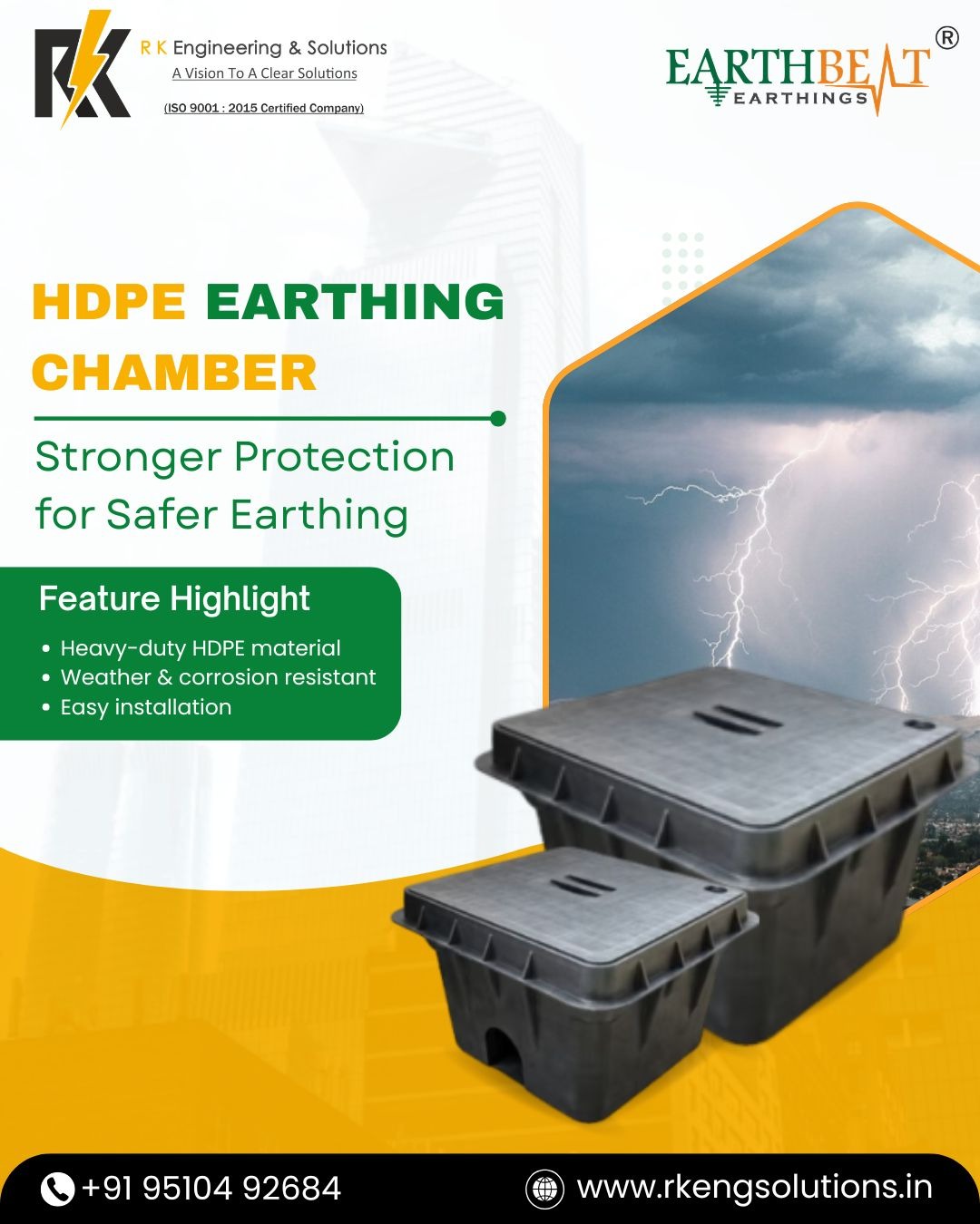R K Engineering & Solutions is a reputed HDPE Earthing Chamber Manufacturer in Ahmedabad, delivering precision-engineered chambers designed for superior durability, dependable performance, and smooth, time-saving installation. These chambers are widely used in office complexes, shopping malls, hospitals, hotels, IT parks, parking areas, and outdoor installations to safeguard earthing points from moisture, dust, and physical damage.